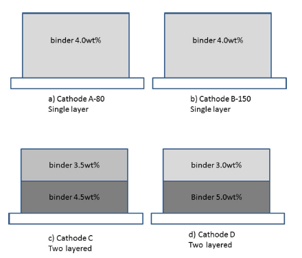 在設(shè)計(jì)高能量密度電池時(shí),電極厚度一般很大。根據(jù)烘烤過(guò)程的電極特性,Darjen Liu等人提出了一個(gè)新型的雙層涂布,分別設(shè)計(jì)兩種不同粘結(jié)劑含量的漿料,上涂層的粘接劑含量低于下涂層,通過(guò)增加下涂層的粘接劑含量來(lái)彌補(bǔ)粘接劑在干燥過(guò)程中向表面遷移帶來(lái)的影響。下圖為不同涂布方案,其中80℃,150℃分別表示烘烤溫度,3.0wt%,3.5wt%,4.0wt%,4.5wt%,5.0wt%分別表示不同粘結(jié)劑含量的漿料涂層。