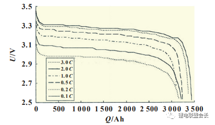 姜翠娜等研究了放電倍率對(duì)磷酸鐵鋰電池單體可放出 容量的影響,將一組同一型號(hào)初始一致性較好的單體電池均 以1C電流充電至3.8V,然后分別以0.1、0.2、0.5、1、2、3C的放電倍率放電至2.5V,記錄電壓與放出電量之間的關(guān)系曲線,如圖1所示。實(shí)驗(yàn)結(jié)果表明,1 、2C放出的容量分別是 C/3放出容量的97.8%和96.5%,放出的能量分別是C/3 放出的能量的97.2%和94.3%,由此可見(jiàn)隨著放電電流的增大,鋰離子電池放出的容量和放出的能量有明顯減少。