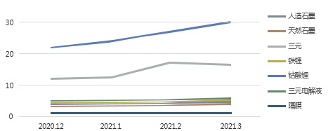從價格層面來看,2021Q1四大主材價格均呈現(xiàn)不同程度上漲,除隔膜外,其余產(chǎn)品漲幅(3月較12月)均超15%,部分產(chǎn)品漲幅超50%,主要原因為: