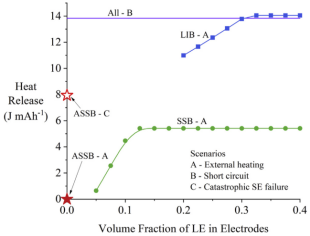 失效模式A下,添加少量LE的SSB比ASSB產(chǎn)生的熱量更多,但仍比LIB少得多。對于SSB,當(dāng)體積分?jǐn)?shù)高于0.125時,正極產(chǎn)生的O2已經(jīng)與LE反應(yīng)完全,形成一個平臺。由于LE與負(fù)極Li反應(yīng),所以LIB的體積分?jǐn)?shù)在0.3時上會有一個平臺。值得注意的是,由于NMC的氧損失是吸熱的,當(dāng)LE的體積分?jǐn)?shù)小于0.08時,熱釋放可忽略。其它失控模式下,ASSB和SSB并不比LIB更安全。短路失效模式在ASSB、SSB和LIB中的熱釋放是相同的。失效模式C下,反應(yīng)的熱釋放可能是巨大的。